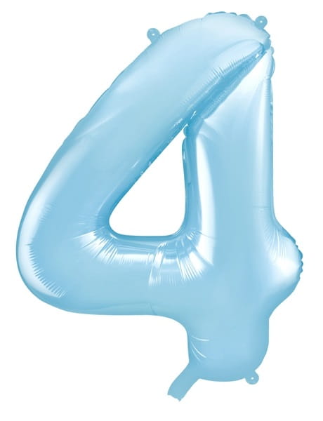 Balon foliowy w kształcie cyfry 4 w niebieskim, pastelowym kolorze stworzy doskonały wystrój imprezowej sali.