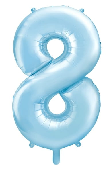 Balon foliowy w kształcie cyfry 8 w niebieskim, pastelowym kolorze stworzy doskonały wystrój imprezowej sali.