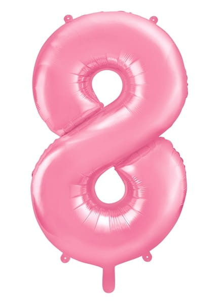 Balon foliowy w kształcie cyfry 8 w różowym, pastelowym kolorze stworzy doskonały wystrój imprezowej sali.