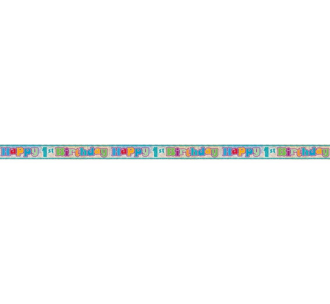 Baner wykonany z kolorowej folii z napisem Happy 1st Birthday.