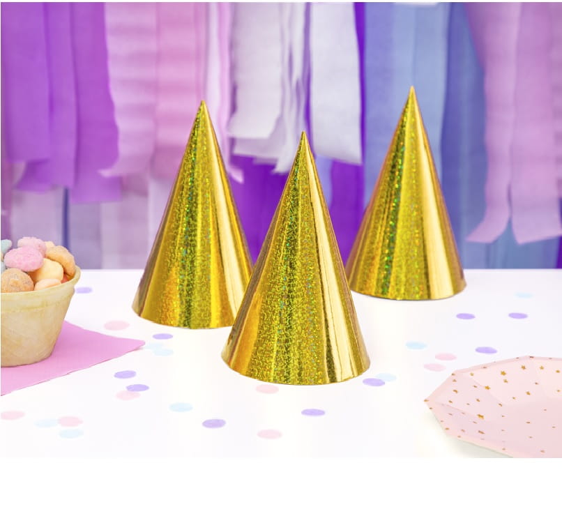 Czapeczki z metalicznego, holograficznego papieru w złotym kolorze stworzą imprezę w doskonałym, karnawałowym stylu.