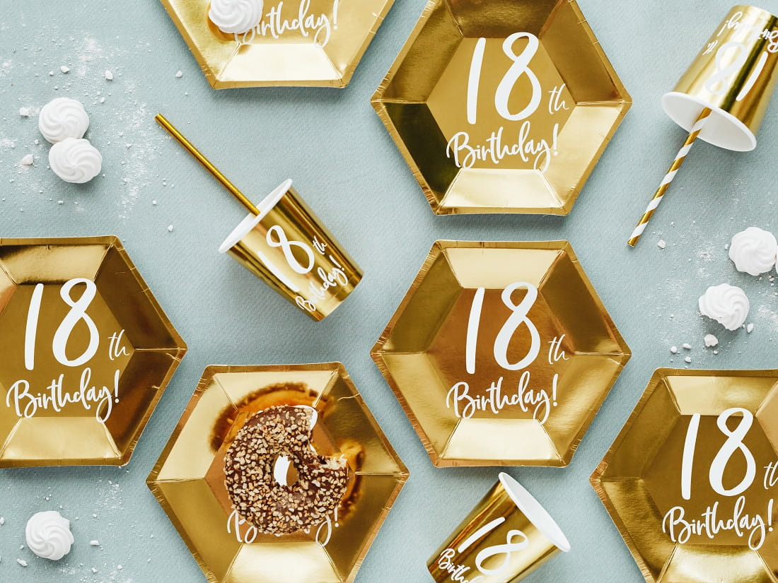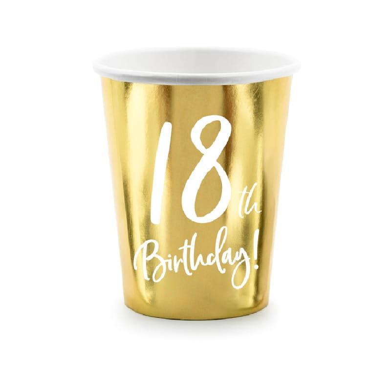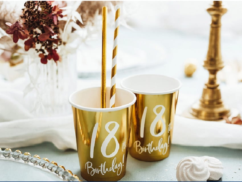 Złote, metalizowane kubki papierowe z białym napisem "18-th Birthday" sprawdzą się podczas podawania imprezowych napojów.