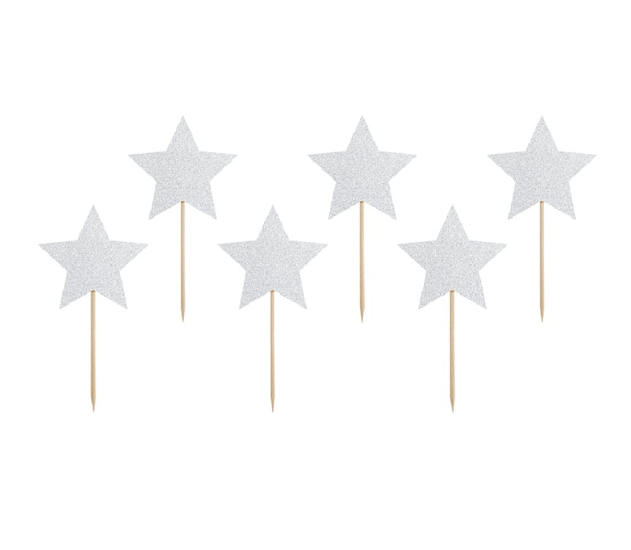Papierowe plakietki do przekąsek na patyczkach w kształcie gwiazdek w srebrnym, brokatowym kolorze.