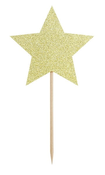 Papierowe plakietki do przekąsek na patyczkach w kształcie gwiazdek w złotym, brokatowym kolorze.