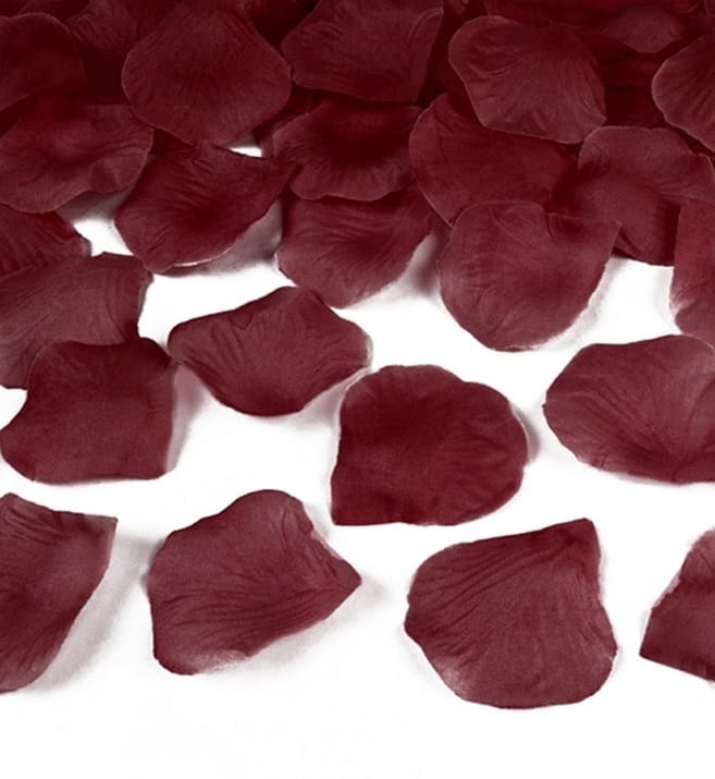 Bordowe płatki róż, wykonane z materiału.