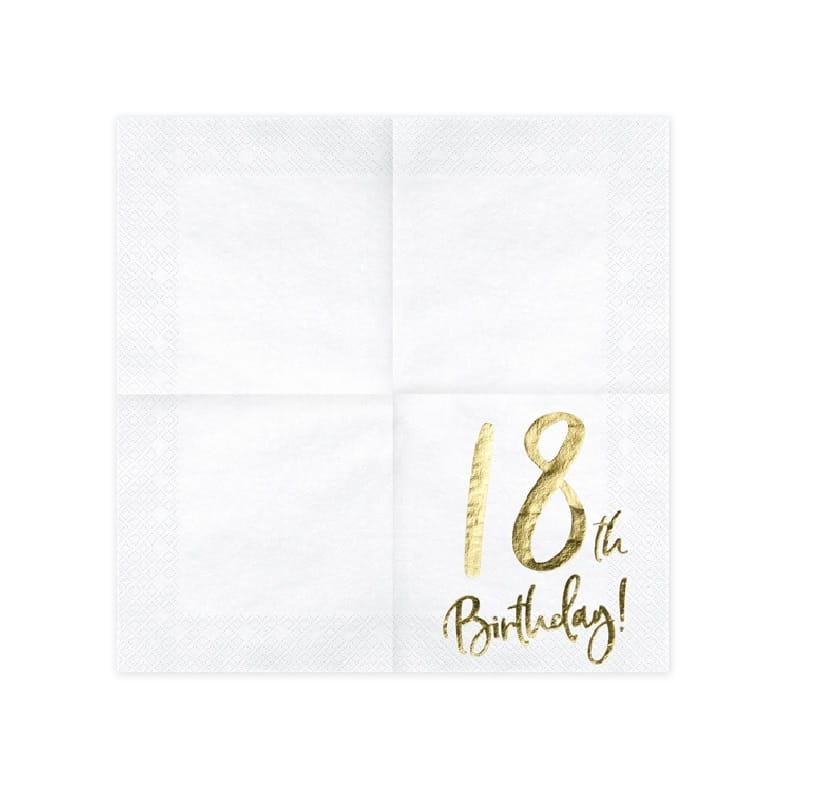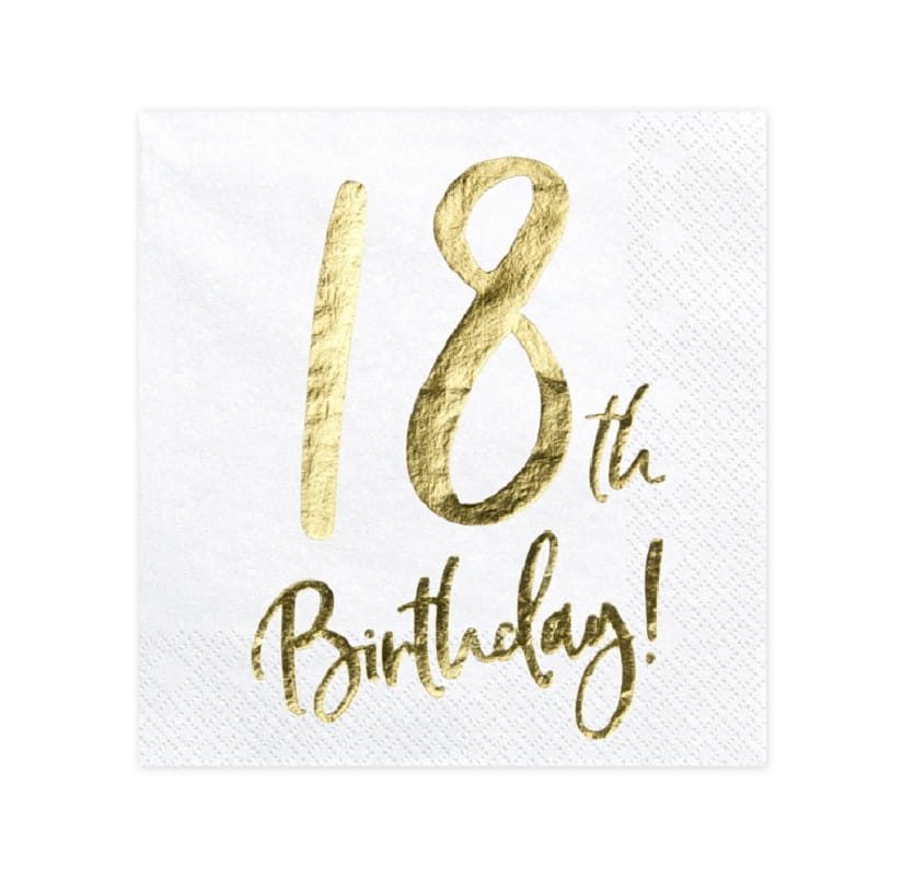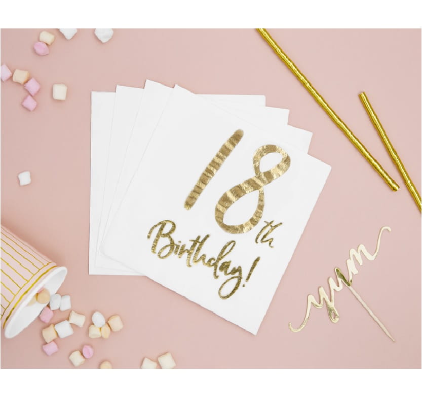 Białe serwetki ze złotym nadrukiem "18th Birthday" skomponują się z pozostałymi akcesoriami z serii GOLD.