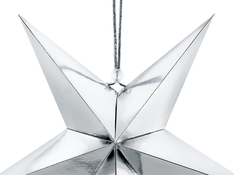 Przestrzenna dekoracja wykonana ze srebrnego, lustrzanego papieru, mocowana za pomocą srebrnego sznureczka.