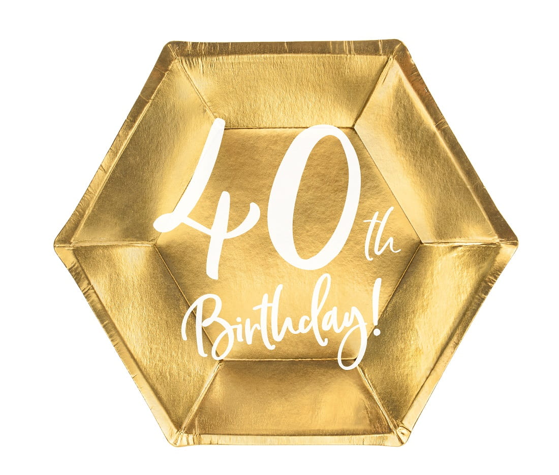 Złote, metalizowane talerzyki papierowe z białym napisem "40-th Birthday" sprawdzą się podczas podawania imprezowych przystawek.