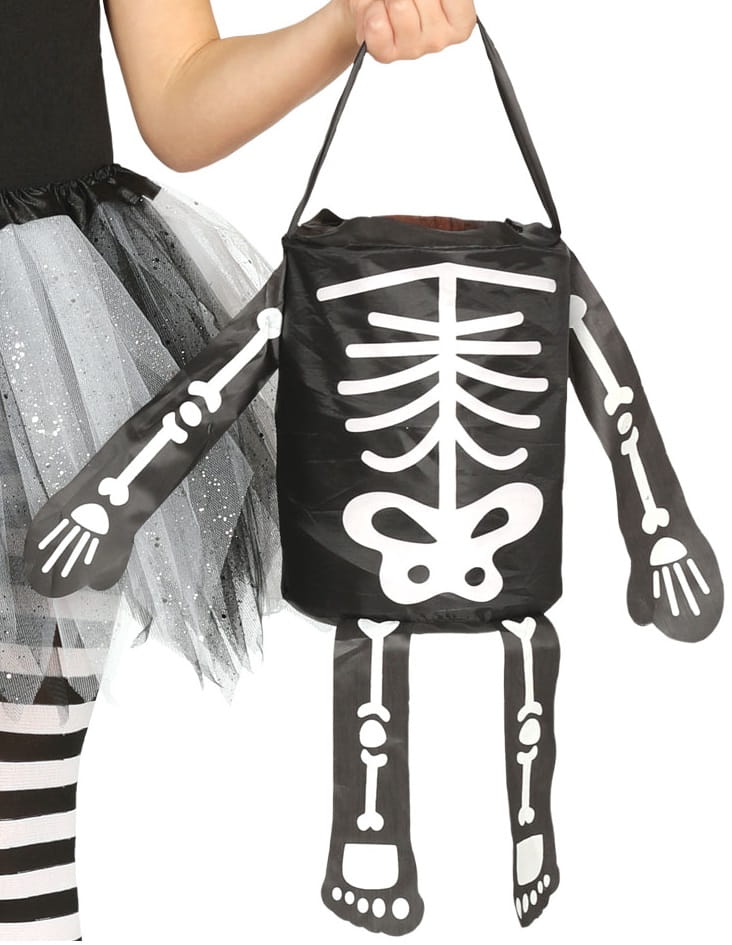 Torebka Szkieletor w formie wiaderka na cukierki doskonale komponuje się z kostiumem na Halloween.
