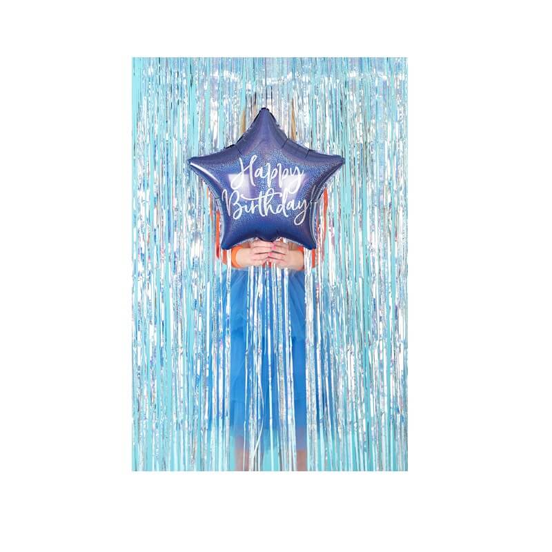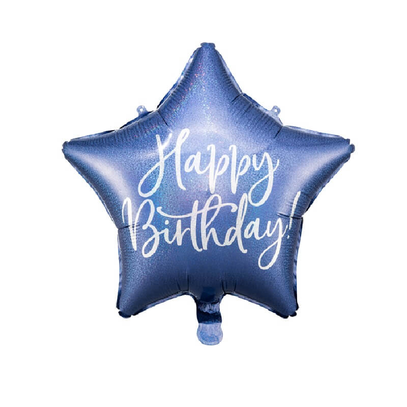 Balon foliowy w kształcie gwiazdy w holograficznym, granatowym kolorze z napisem Happy Birthday, stworzy doskonały wystrój urodzinowej sali.