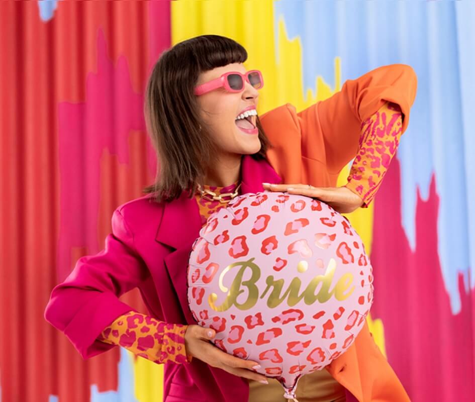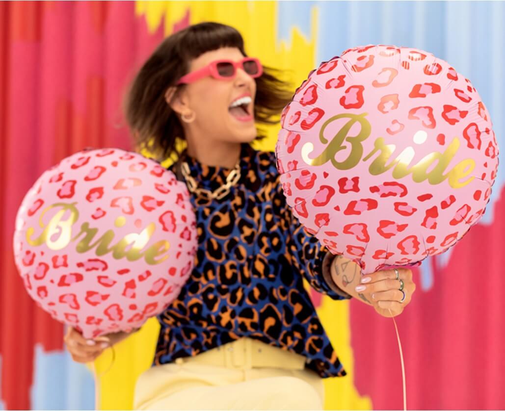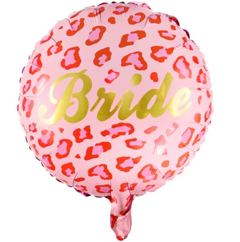 Różowy balon z dwustronnym, różowym nadrukiem oraz złotym napisem Bride.