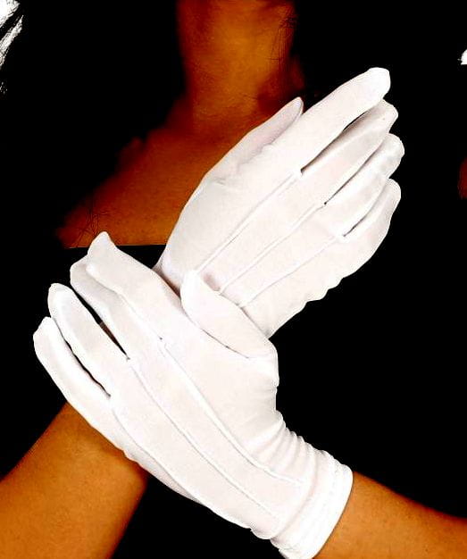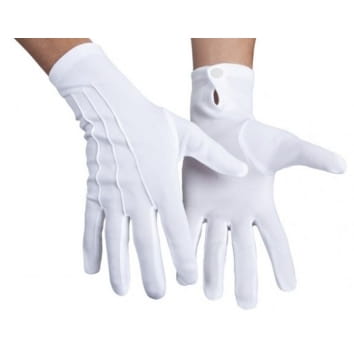 Białe rękawiczki wykonane rozciągliwego materiału, z ozdobnymi zaszyciami i guziczkiem.