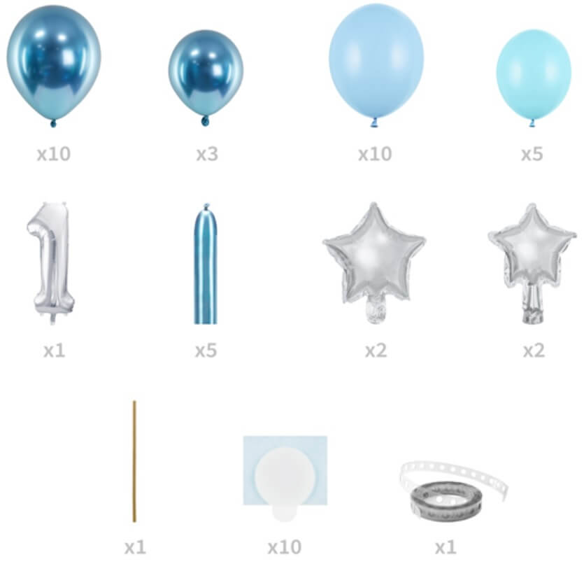 Zestawu dekoracji na 1 urodziny dziecka w niebiesko srebrnej kolorystyce.