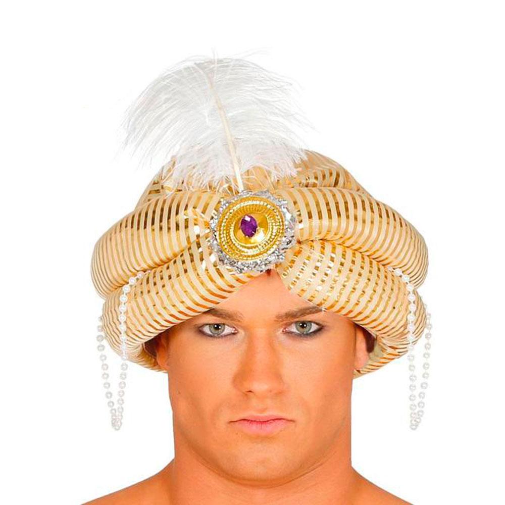 Złoty turban Maharadży w kolorze złotym z białym piórkiem u góry i perłami zwisającymi z obu stron. Idealny dodatek do stroju z Baśni 1000 i jednej nocy, do stroju Króla Trzech Króli, stroju maharadży oraz każdego stroju o tematyce arabskiej.