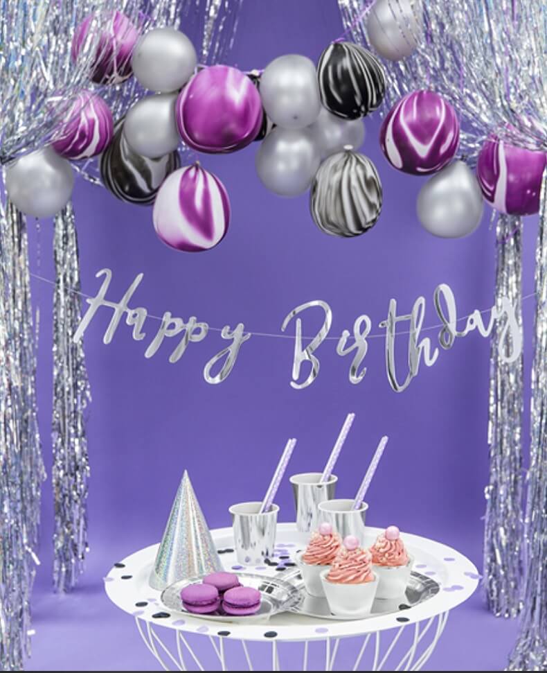 Baner wykonany z papieru lustrzanego w srebrnym kolorze, w kształcie literek tworzących napis HAPPY BIRTHDAY.