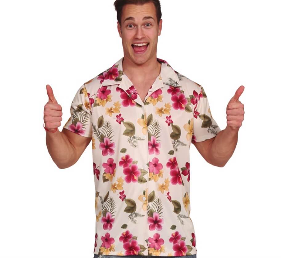 Koszulka z kołnierzykiem zapinana z przodu na guziki wykonana z rozciągliwego materiału z kolorowym nadrukiem kwiatów idealna na Aloha Party.
