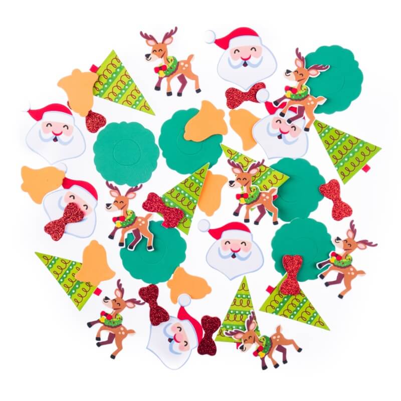 Naklejki z pianki z motywem świątecznym Mikołaja, choinki, renifera, dzwonka, wieńca i brokatowej kokardki.