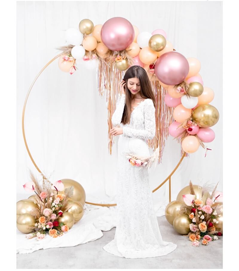 Wrzosowa dekoracja zawieszona pod sufitem tworzy piękne, mieniące się tło, które doskonale sprawdzi się jako ścianka do zdjęć.