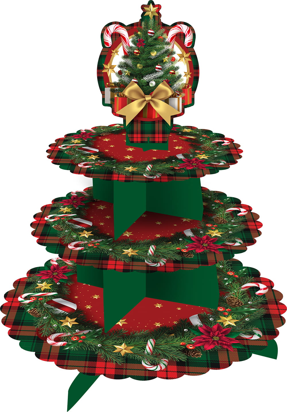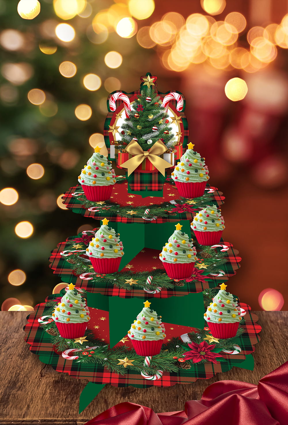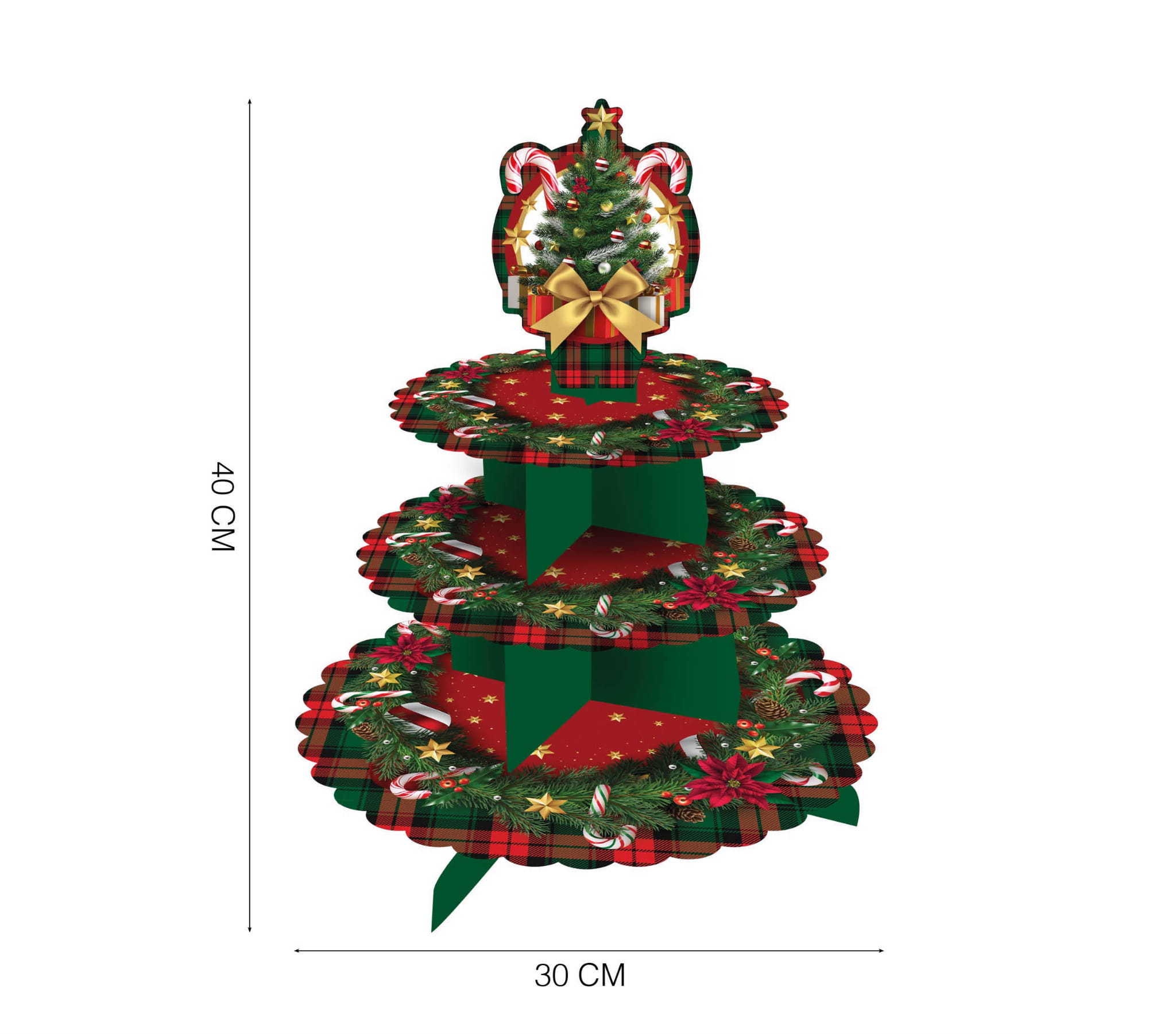 Trójpoziomowa patera świąteczna idealna na wigilijny stół, bożonarodzeniowe przyjęcia i słodki bufet. To stylowy sposób na podanie świątecznych przysmaków takich jak babeczki, pierniczki, makaroniki czy inne świąteczne przekąski. Patera o wysokości 40 cm i średnicy 30 cm została wykonana z grubej, wytrzymałej tektury, ozdobionej świątecznymi motywami: choinką oraz klasyczną szkocką kratką.