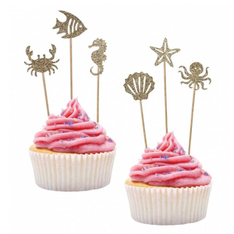 Pikery, Toppery Syrenka Podwodny Świat, złote brokatowe 6 szt.