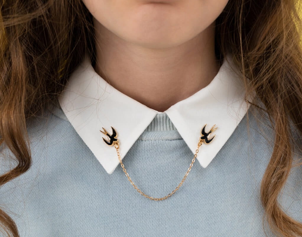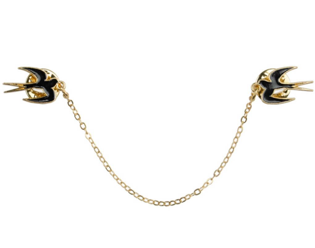 Przypinka z łańcuszkiem w kolorze złotym z czarnymi figurkami w kształcie jaskółek.