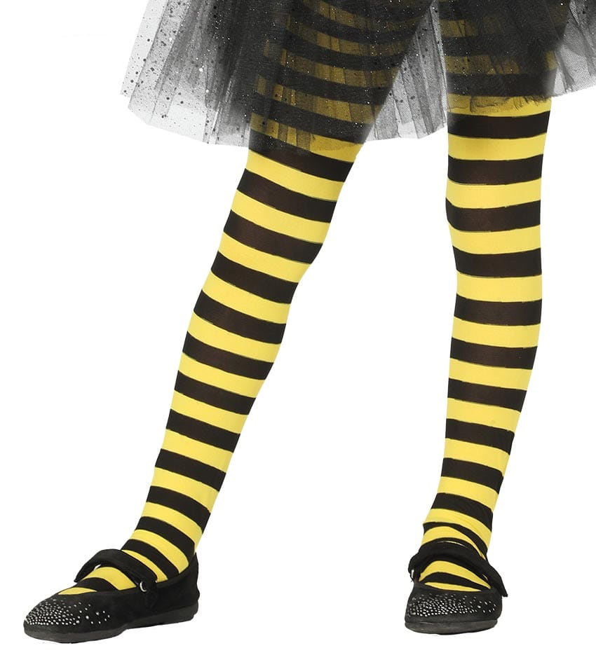 Imprezowe rajstopy wykonane z rozciągliwego materiału w żółto-czarne paski.