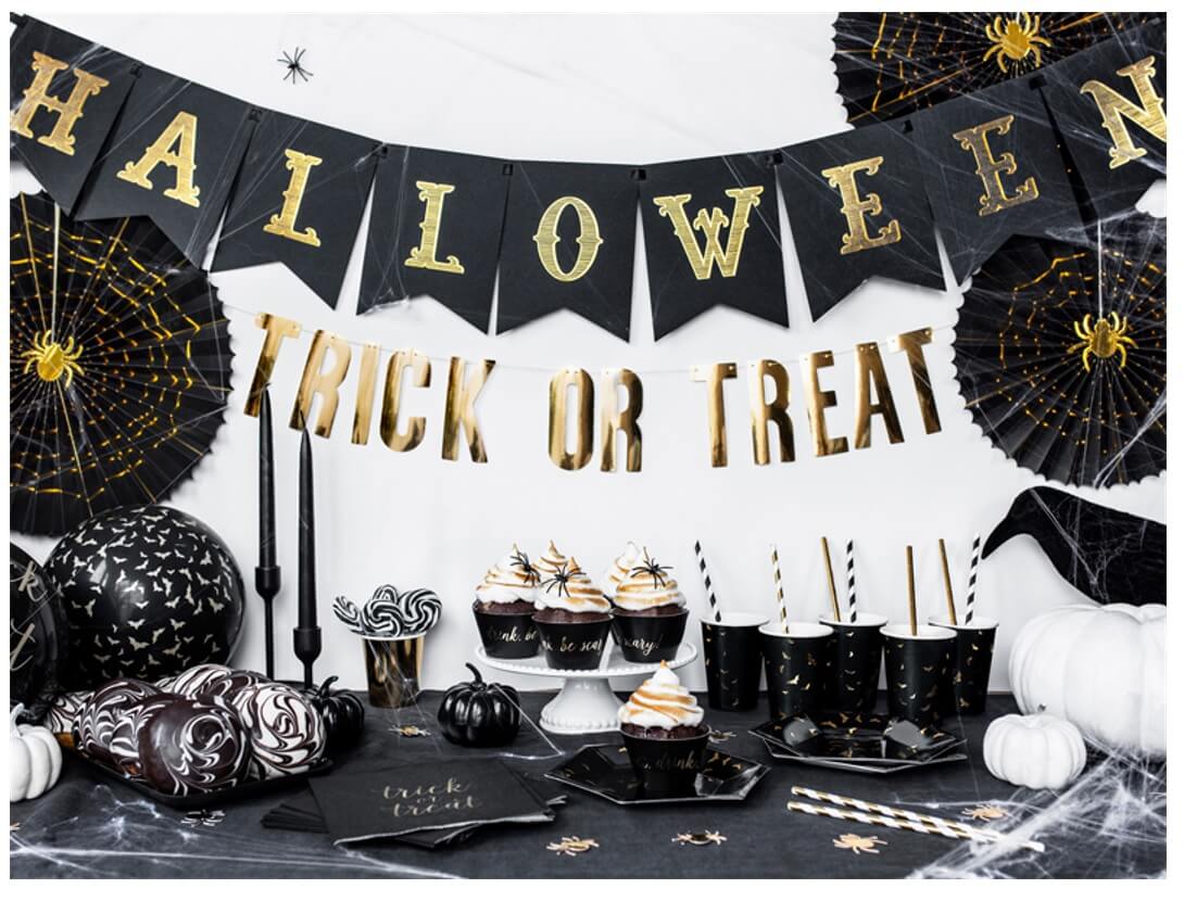 Rozety w czarnym kolorze z złotym metalizowanym nadrukiem pajęczyny i pająka stworzą doskonałą dekorację na Halloween.