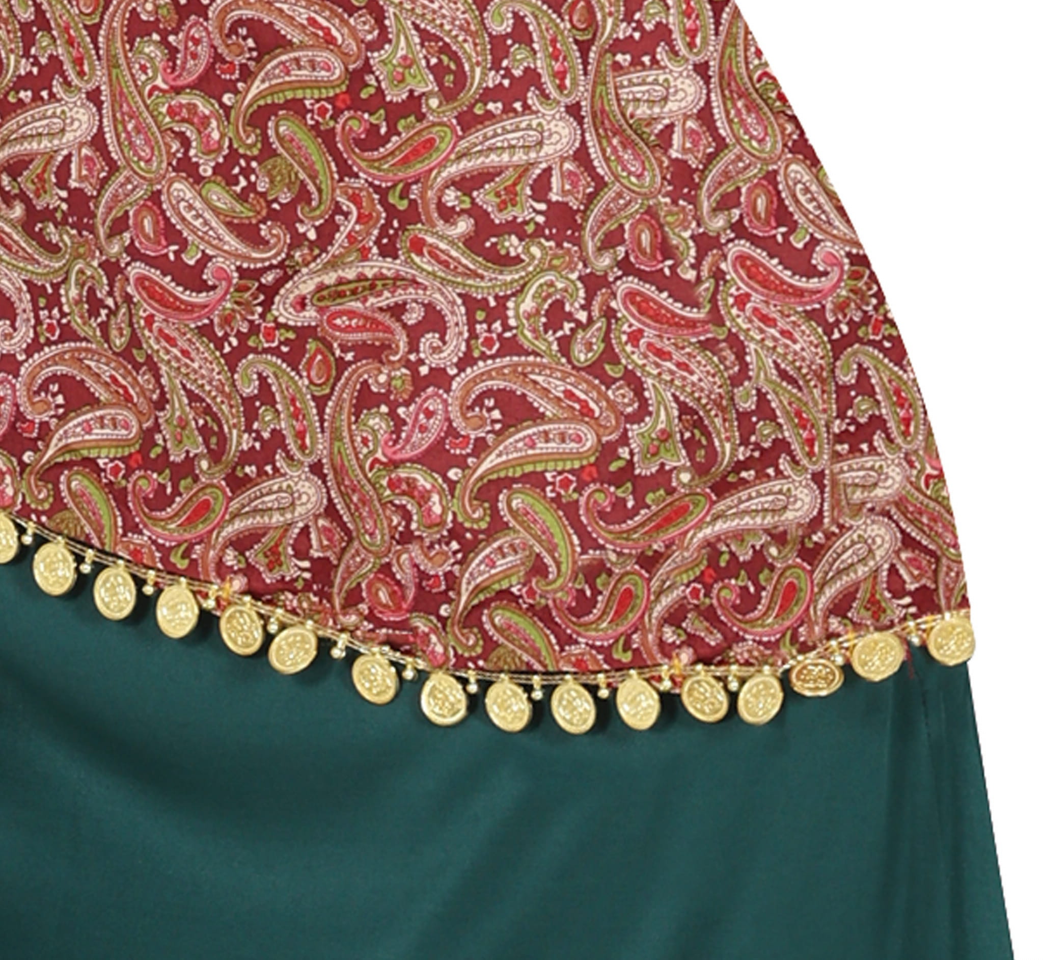 - Sukienka: długa sukienka z imitacją gorsetu oraz chustą w pasie. Dodatkowo elementy stroju ozdobione są brzęczącymi medalionami, które dodają tajemniczego charakteru i wprowadzają wróżbiarski klimat.