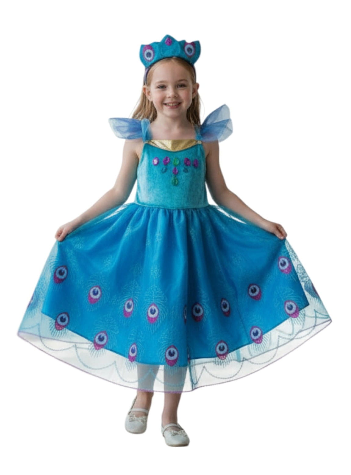 Wybierz dla niej niebieską suknię ozdobioną pawimi oczkami.
