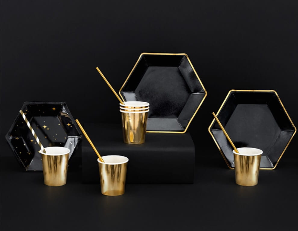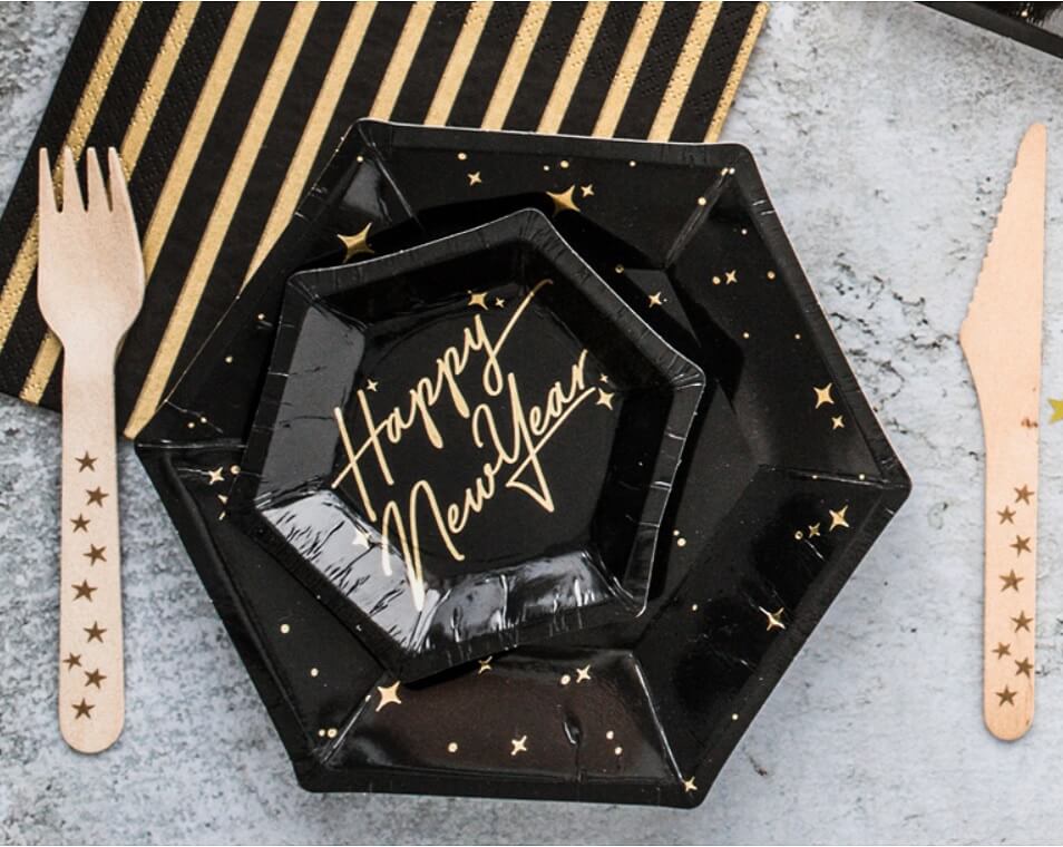 Czarne talerzyki papierowe ozdobione nadrukiem złotych gwiazd sprawdzą się podczas podawania imprezowych przystawek.