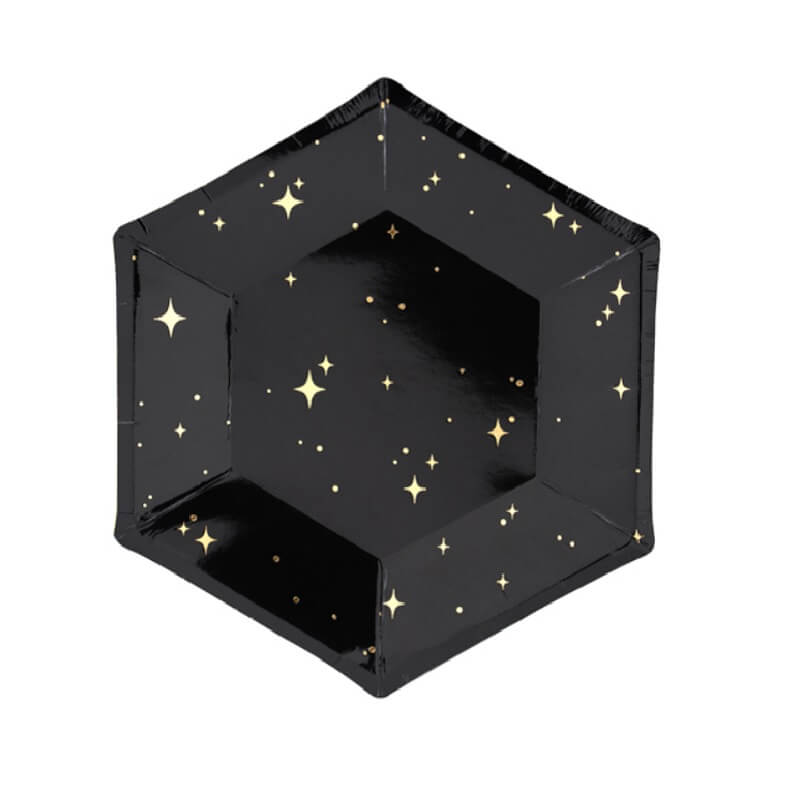 Talerzyki czarne w złote gwiazdki 20 cm, 6 szt.