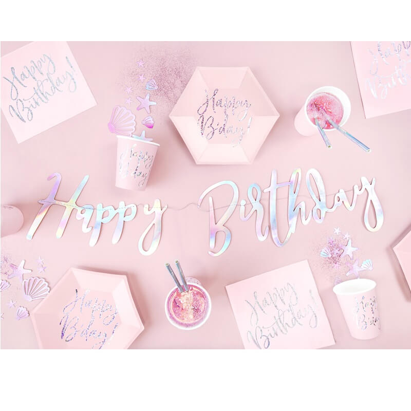 Użyj talerzyków w różowym kolorze z holograficznym napisem Happy Birthday i stwórz efektowny wystrój HOLO.