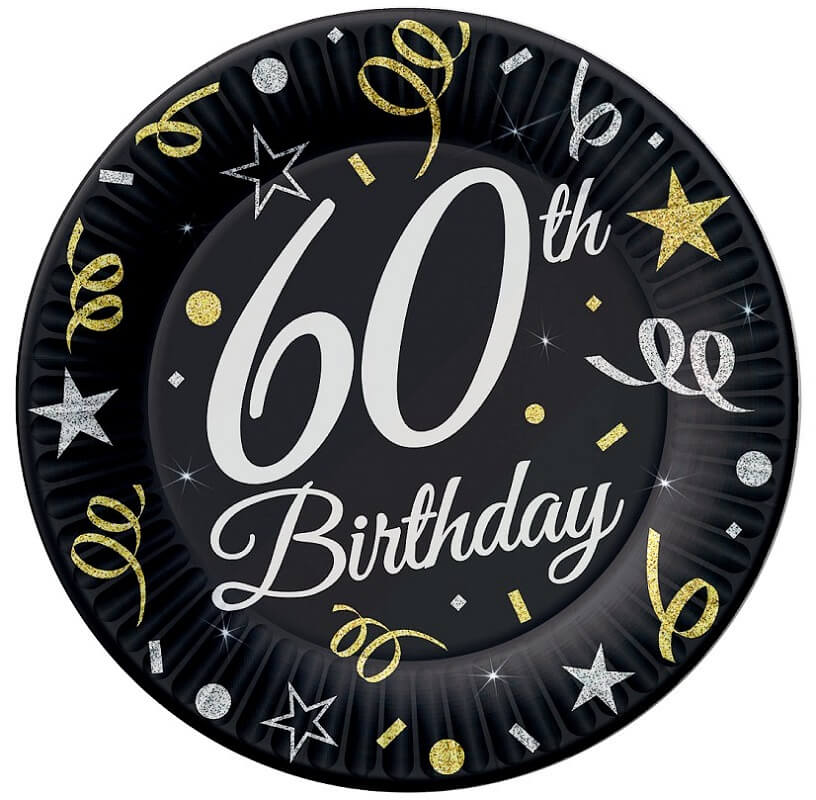 Czarne talerzyki papierowe z białym napisem "60th Birthday" oraz srebrnymi i złotymi serpentynami sprawdzą się podczas podawania imprezowych przekąsek.