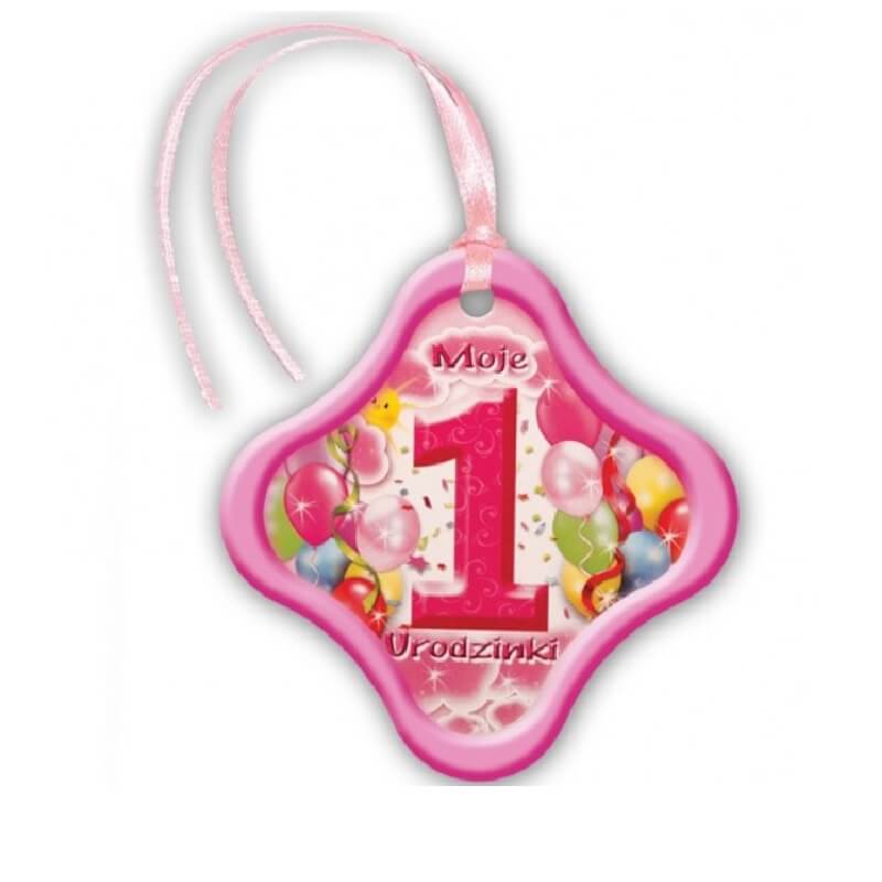 Różowe etykietki na butelkę z nadrukiem baloników i napisem Moje 1 urodzinki, sprawdzą się do dekoracji imprezowego stołu. Do zawieszki dołączona jest atłasowa wstążeczka.
