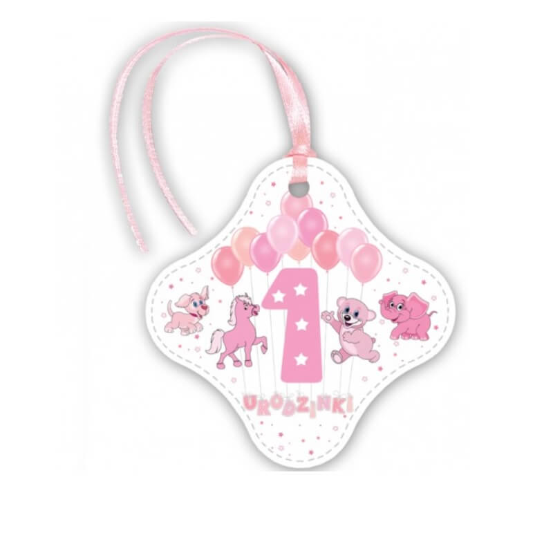 Różowe etykietki na butelkę z nadrukiem zabawek, baloników i napisem 1 urodzinki, sprawdzą się do dekoracji imprezowego stołu. Do zawieszki dołączona jest atłasowa wstążeczka.
