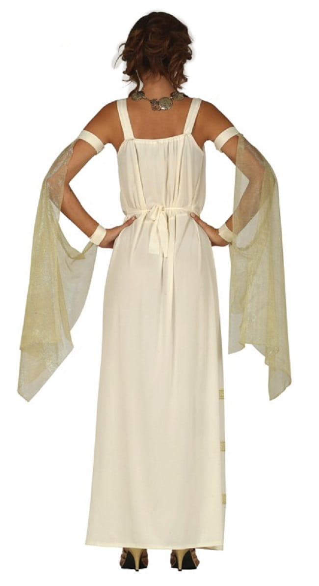 Tunika w kremowym kolorze z lamówkami ozdobionymi złotymi wzorami typu greckie szlaki. Sukienka posiada odcięcie w pasie i wiązanie z tyłu, co pozwala na idealne dopasowanie do sylwetki. Atutem stroju są złote, siateczkowe szale zapinane na ramionach i nadgarstkach, które dodają elegancji i podkreślają antyczny charakter kostiumu.