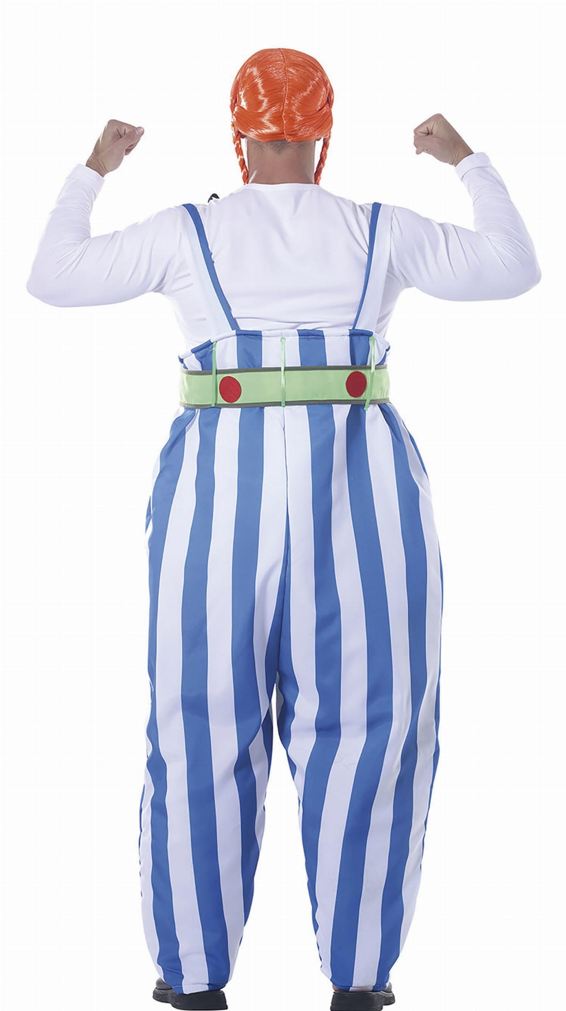 Strój zawiera spodnie typu ogrodniczki w biało-niebieskie pasy oraz zielony pas z czerwonymi kółkami, które doskonale oddają charakterystyczny wygląd tej postaci z popularnej bajki „Asterix i Obelix”.