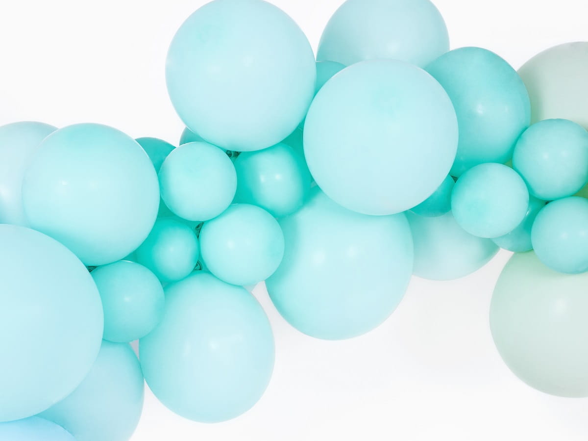 Balony pastelowe w miętowym kolorze wykonane z naturalnego lateksu kauczukowego, dzięki czemu są trwałe oraz przez długi czas utrzymują jednolity kształt.