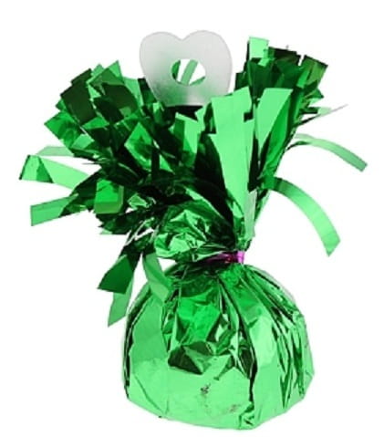Ciężarek do balonów pokryty zieloną, metalizowaną folią.
