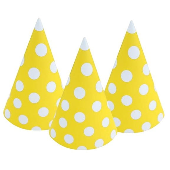 Czapeczki papierowe w kolorze żółtym w białe groszki doskonale sprawdzą się podczas przyjęcia.
