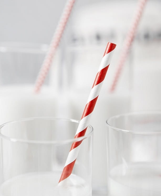 Papierowe słomki w biało-czerwone, ukośne paseczki to niezbędny element przyjęcia urodzinowego i nie tylko.