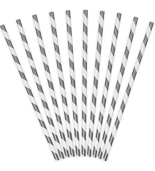 Słomki papierowe do napojów biało-srebrne paski 10 szt.