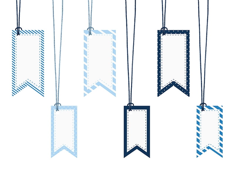 Zawieszki dekoracyjne z niebieskimi i błękitnymi sznureczkami.